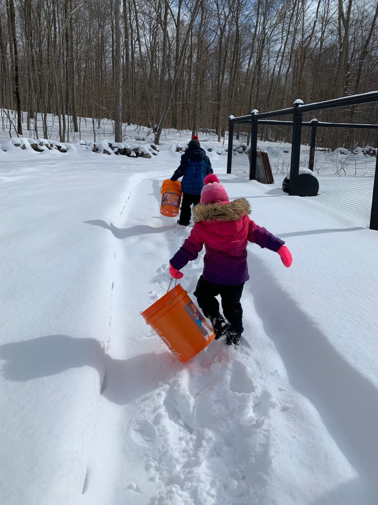 We usually do this outside in a kiddie pool, but this year we were battling Tropical Storm Henri. Therefore, we had to bring our entire operation indoors. We filled our kitchen sink with luke warm water and washed all the dirt off the tomatoes.