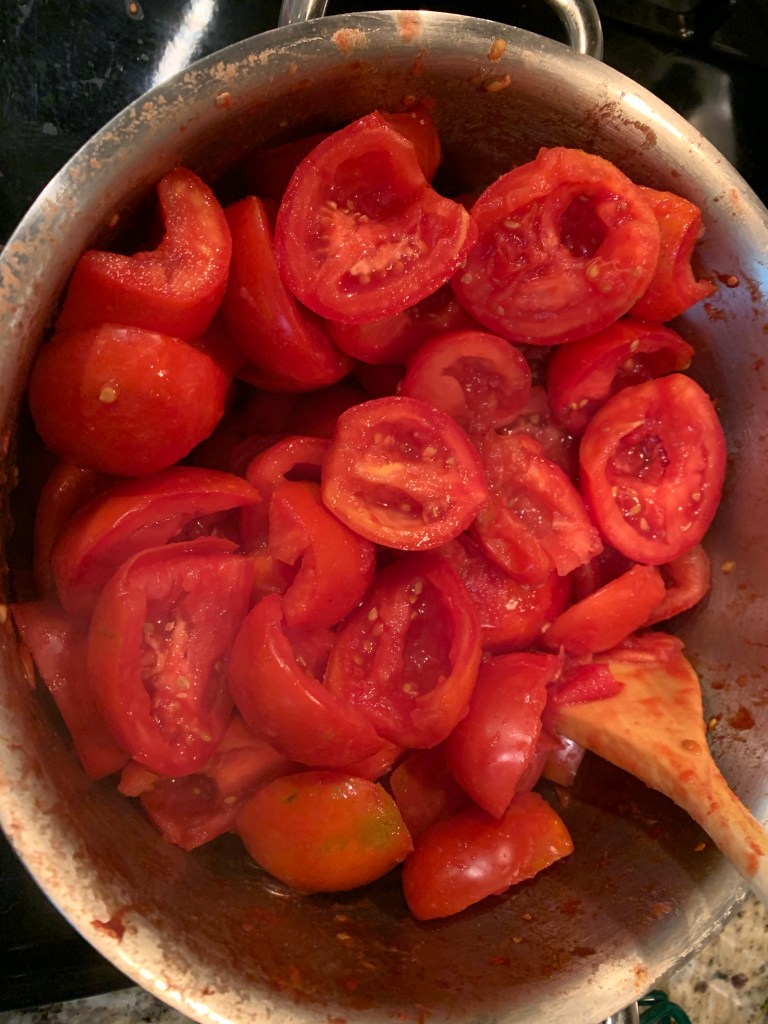 Put the pot with tomatoes over medium heat, stirring occasionally so the tomatoes don’t stick to the bottom of the pot and burn.