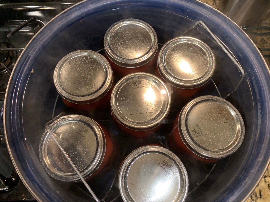 Keep an eye on the pot. When the water reaches a roaring boil, set a timer for 45 minutes. For safe canning, quarts of sauce must be boiled at a roaring boil, with the lids fully covered in water for a full 45 minutes.