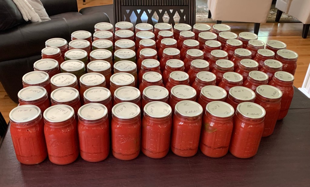 Every year on average, we process somewhere around 65 plus or minus (usually plus) jars of sauce. Let’s do a little math here…..